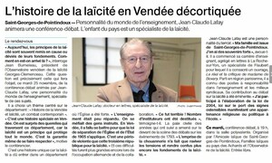 La conférence sur « l’Histoire de la Vendée et Laïcité, un combat contemporain » par Jean-Claude Lafay, ancien élève de l’ENS, licencié en sociologie, docteur es lettres de l’Université de Nantes avait été annoncée par Ouest-France (voir l’article ci-dessous). Organisée par l’OVLGC, l’Amicale Laïque de St Georges de Pointindoux et les Familles Laïques des Achards, elle s’est tenue dans la salle polyvalente de St Georges de Pointindoux devant un public nombreux.